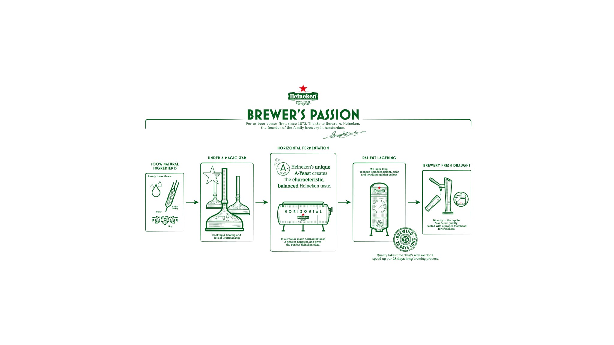 We take 28 days to brew Heineken. To get the perfectly balanced taste, refreshing clarity and beautiful golden-yellow colour. Quality takes time, it's worth it.